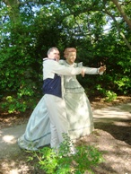 A dashing character in period costume brandishes his cane and addresses those at the table asking, 'Were you invited?'