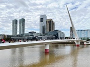 El Puente de la Mujer (Women's Bridge) is one of the most famous landmarks in the neighbourhood of Puerto Madero. The rotating footbridge was the first work from Valencian architect Santiago Calatrava in Latin America and demonstrates Buenos Aires' constant effort to position itself at the vanguard of art and architecture in the region. The bridge represents a couple dancing tango, with the white mast symbolising the man and the curve of the bridge, the woman. It has a large turning mechanism, allowing it to swing open to allow sailing ships to pass. The bridge was constructed in Spain and donated to Buenos Aires through a private donation